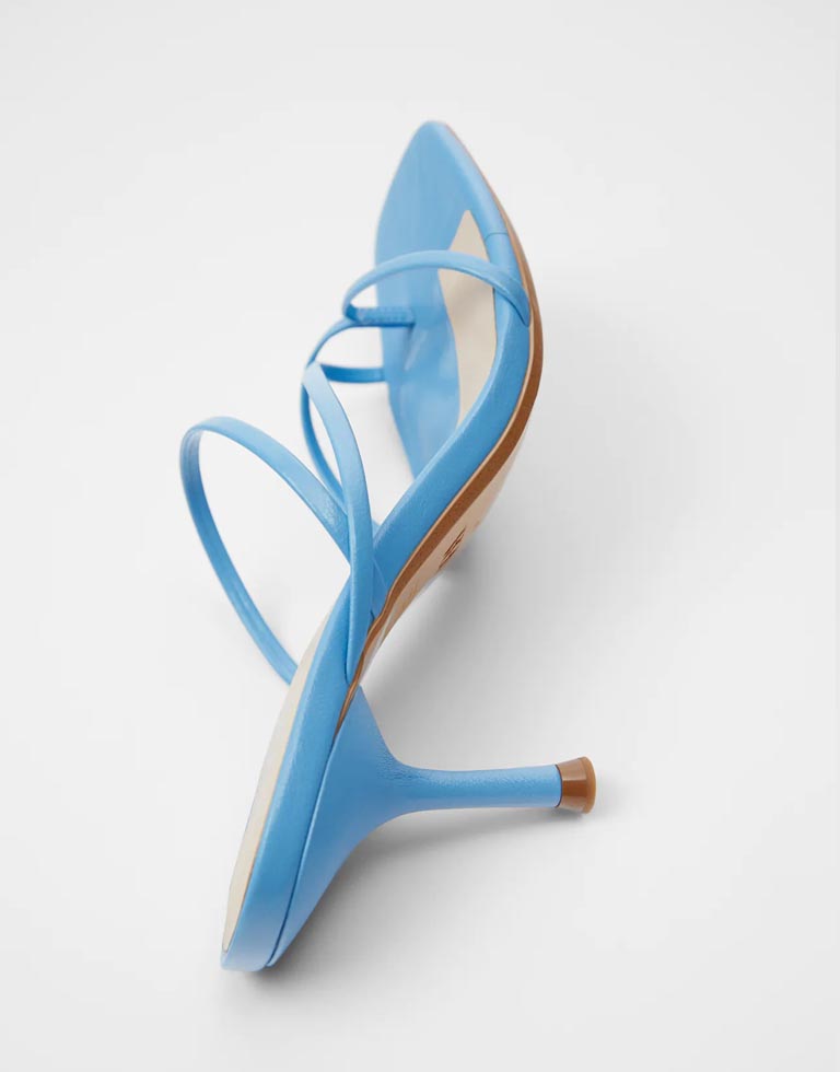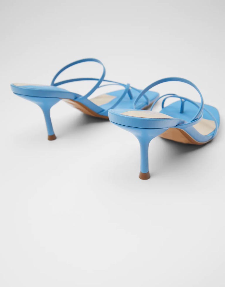 High-heel sandals available in different colours: blue and black. Interwoven thin straps on the front with toe divider. Lined stiletto heel. Square toe.