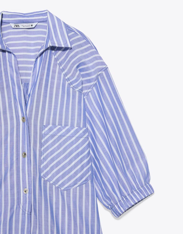 Collared shirt dress with a V-neckline. Sleeves falling below the elbow with elastic trim. Front patch pocket. Asymmetric hem. Polo-style button